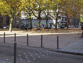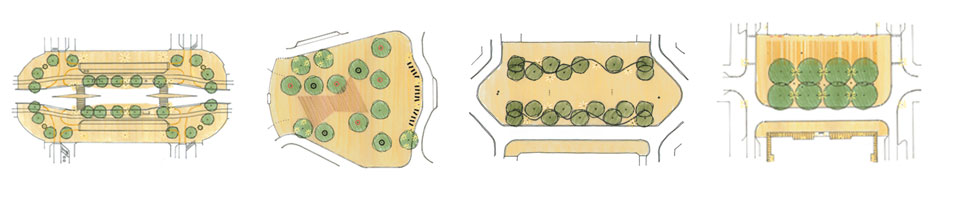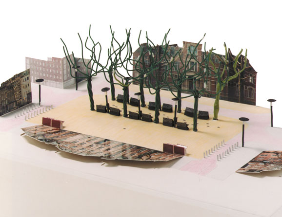 Ontwerp voor 4 pleinen in de Oosterparkbuurt inclusief de pleinwanden (gevelkleuren). Plan genomineerd voor de Omgevingsarchitectuurprijs 2002. Eikenplein uitgevoerd. Kastanjeplein door HWC op basis van het Pleinenplan.